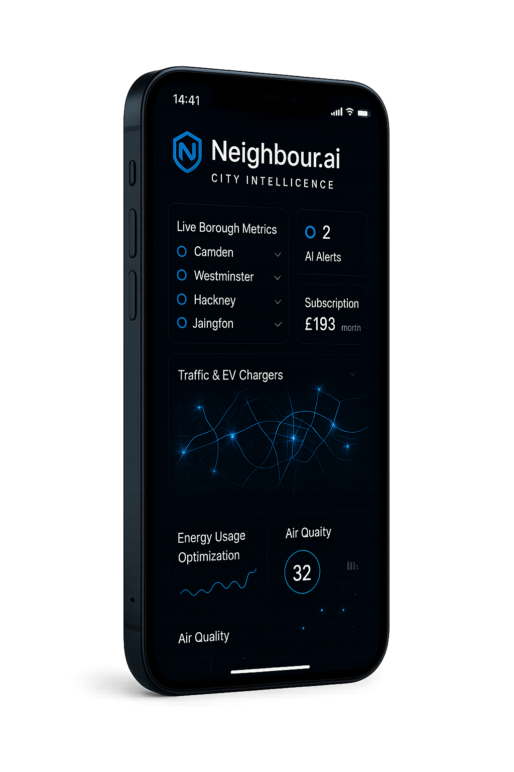 Neighbour.ai can be licensed to city councils, borough authorities, and transport operators on a monthly or annual subscription. Each tenant gets a live view of mobility, safety, energy, and services across their area — all running under a single, trusted brand.